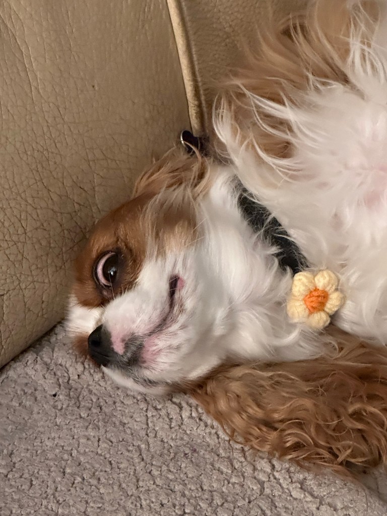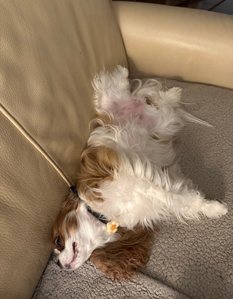 Freshly groomed with a yellow bow on her collar. Linda always picks one out ahead of time and says it’s the best part.