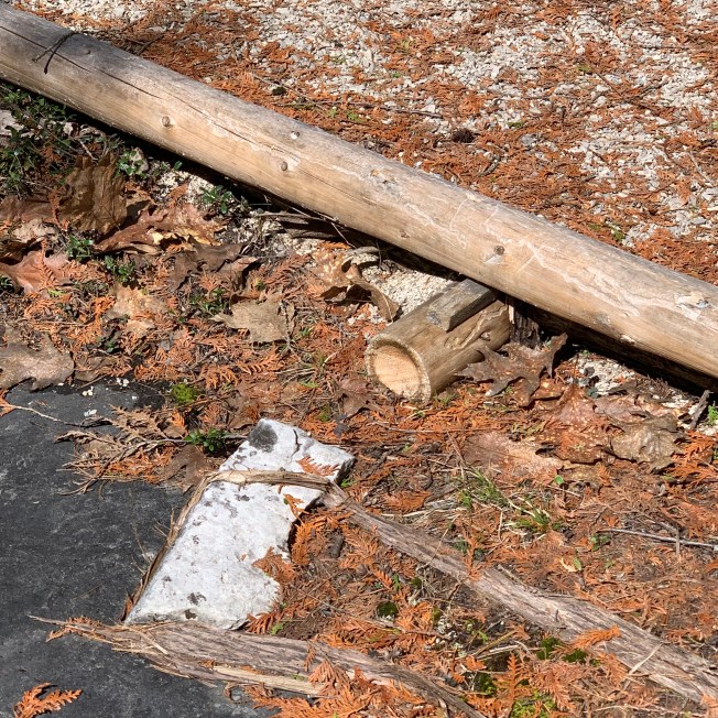 More forest floor and then warning sign of leaning tree and the tree itself.