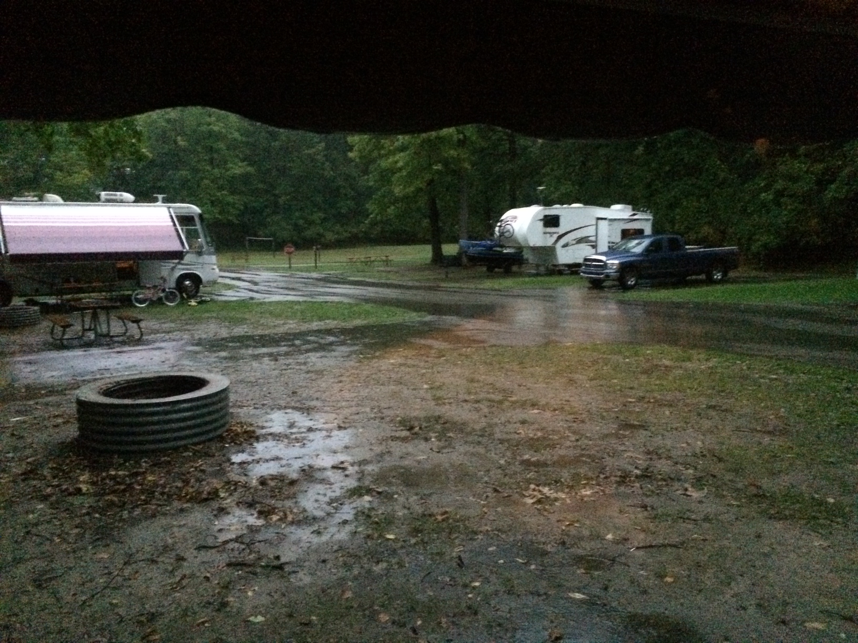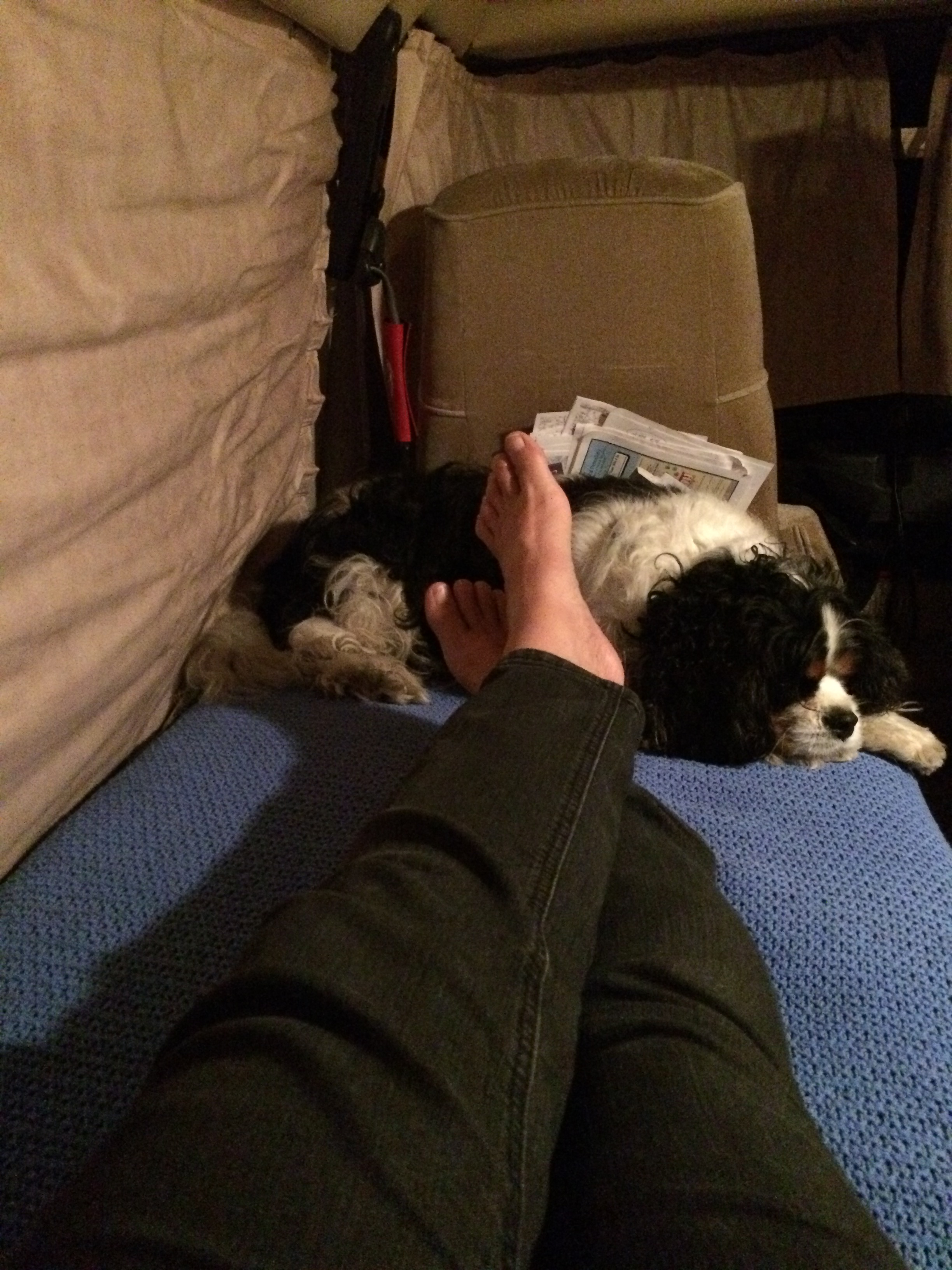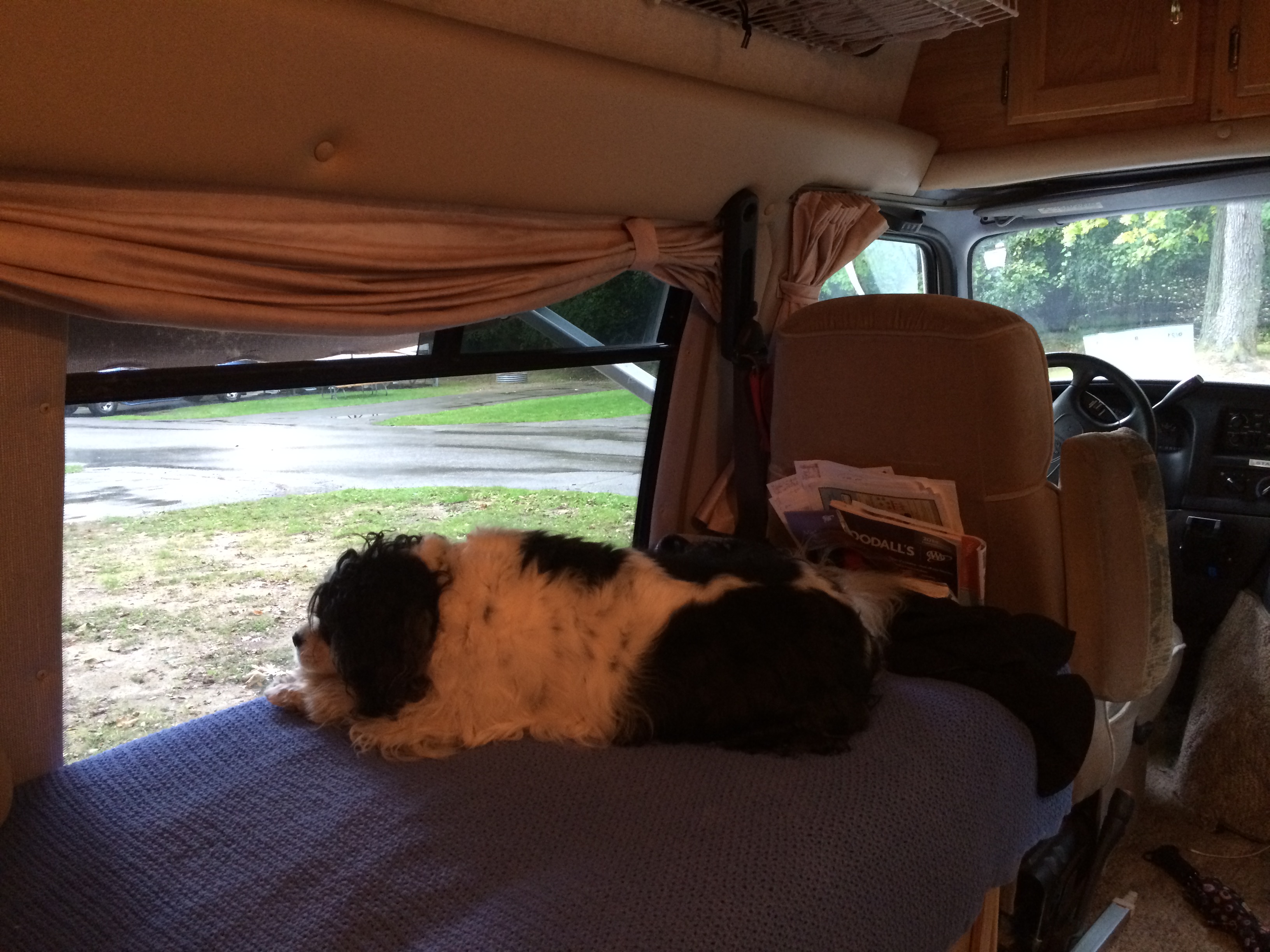 Later quite severe storms blew in with thunder and lightening and gusty winds. I do carry a weather radio (and put fresh batteries in and tested before I left), but not quite bad enough to turn on. So we toughed it out. I should say I toughed it out, because Henry is oblivious to even the loudest of thunderstorms. He’s always the happy camper.