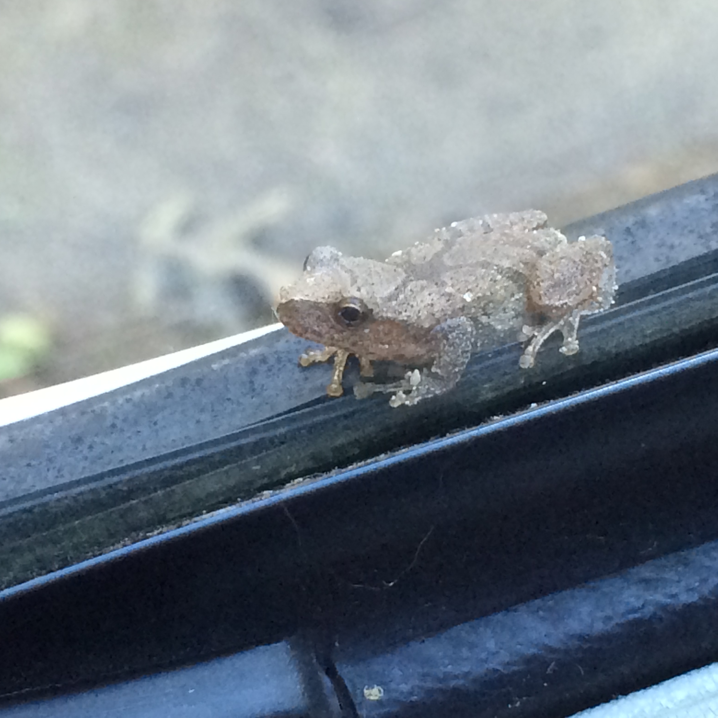 Had a little frog-friend take shelter from the rain alongside Ecovision’s window. Friend Karen thinks it’s a tree frog. Sure was tiny, size of my fingernail.
