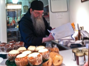 A monk with a very long beard helped me (sorry for the very poor image quality).  I liked that he was fully present and our eyes truly met and exchanged kindnesses.  I asked if taking photographs of the monastery was alright and enthusiastically he said yes.  I left a small donation and when he thanked me I shared that I am a Quaker and respect those seeking to live a holy life.  I bought seedless blackberry jam and plum jelly plus an apricot muffin.